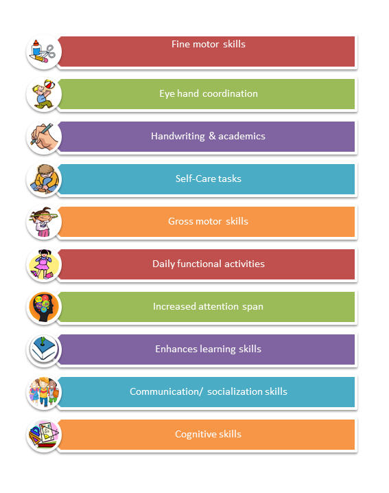 Occupational Therapy will aid with increasing child’s academic, cognitive, fine motor, social and verbal communications, emotional skills, activities of daily living, overall age level skills via therapeutic activities and play interaction. Occupational therapy has been shown to help some kids with learning and attention issues become more independent and successful. This is especially true for young children.The Benefits of Occupational Therapy for Kids Include: